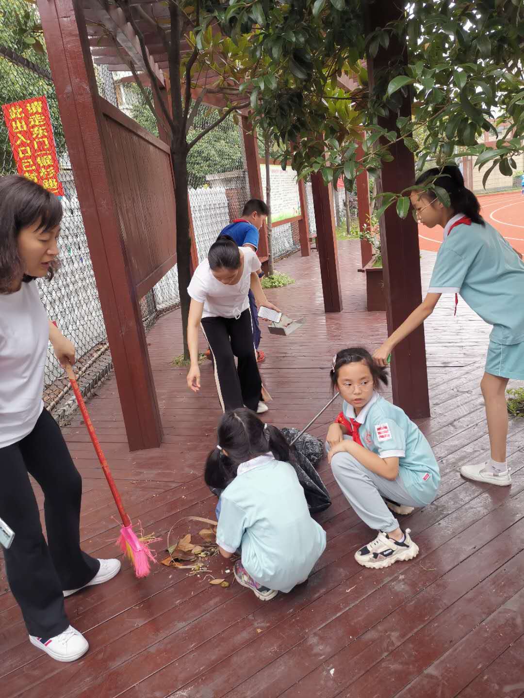 每到周末,温暖1+1志愿者都会聚集在操场上清扫落叶。卫生死角的小纸屑。同学们不怕脏不怕累!