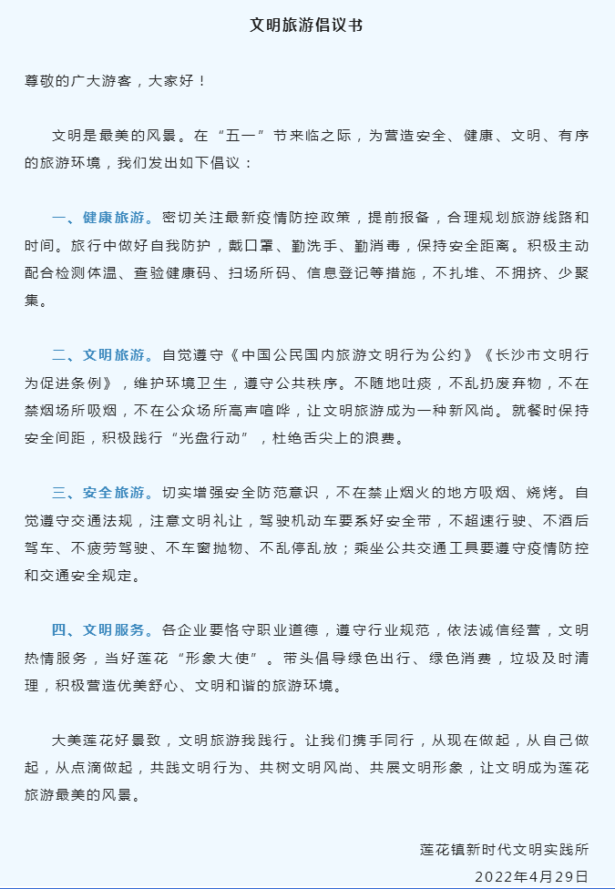 莲花镇地处岳麓西南,群山环绕、山清水秀,是长沙市十佳文旅特色小镇。“五一”将至,莲花镇又将迎来新一波旅游高峰。为提高公民旅游意识,提倡公民文明旅游风尚,保护乡镇生态环境,莲花镇于五一前夕举行此次活动,倡导公民文明出游。