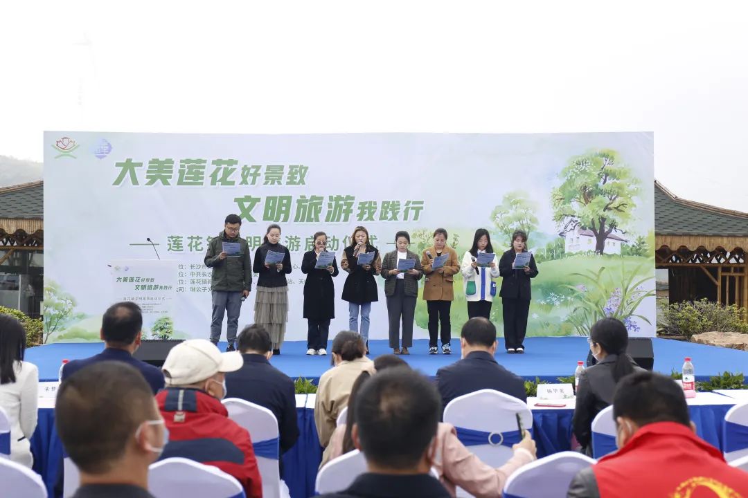 启动仪式上,岳麓区第五实验小学学生代表表演诗朗诵《文明旅游诗词》,莲花镇文旅商家共同宣读《文明旅游倡议书》。现场还为莲花镇6支文明旅游志愿劝导队授旗,并发布了“我在莲花,文明出游”线上打卡活动。